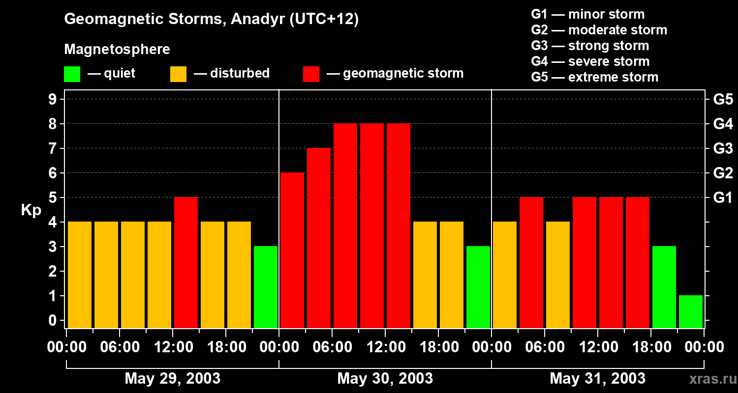 Changes in the geomagnetic index Kp from May 29 to 31, 2003 for mid latitudes