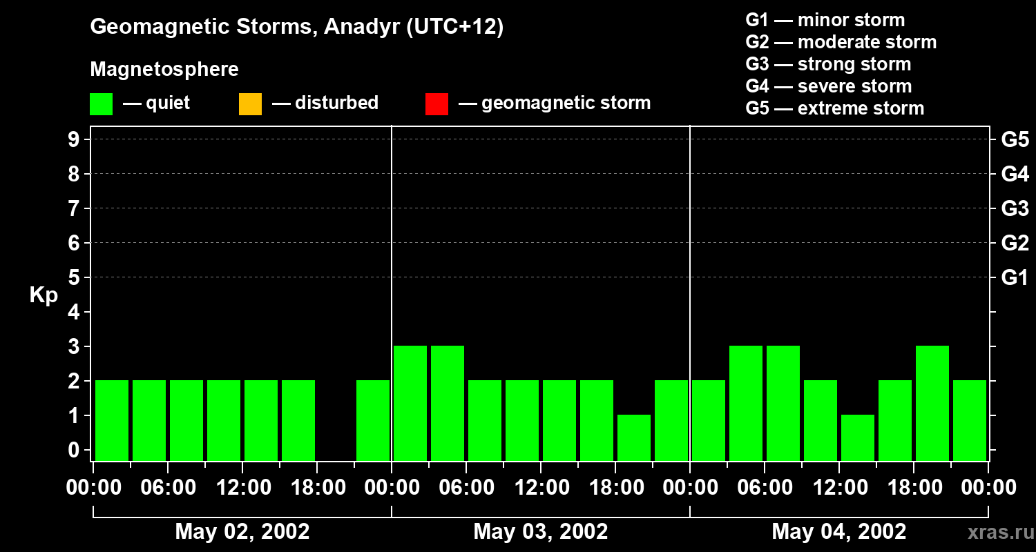 Changes in the geomagnetic index Kp from May 2 to 4, 2002 for mid latitudes