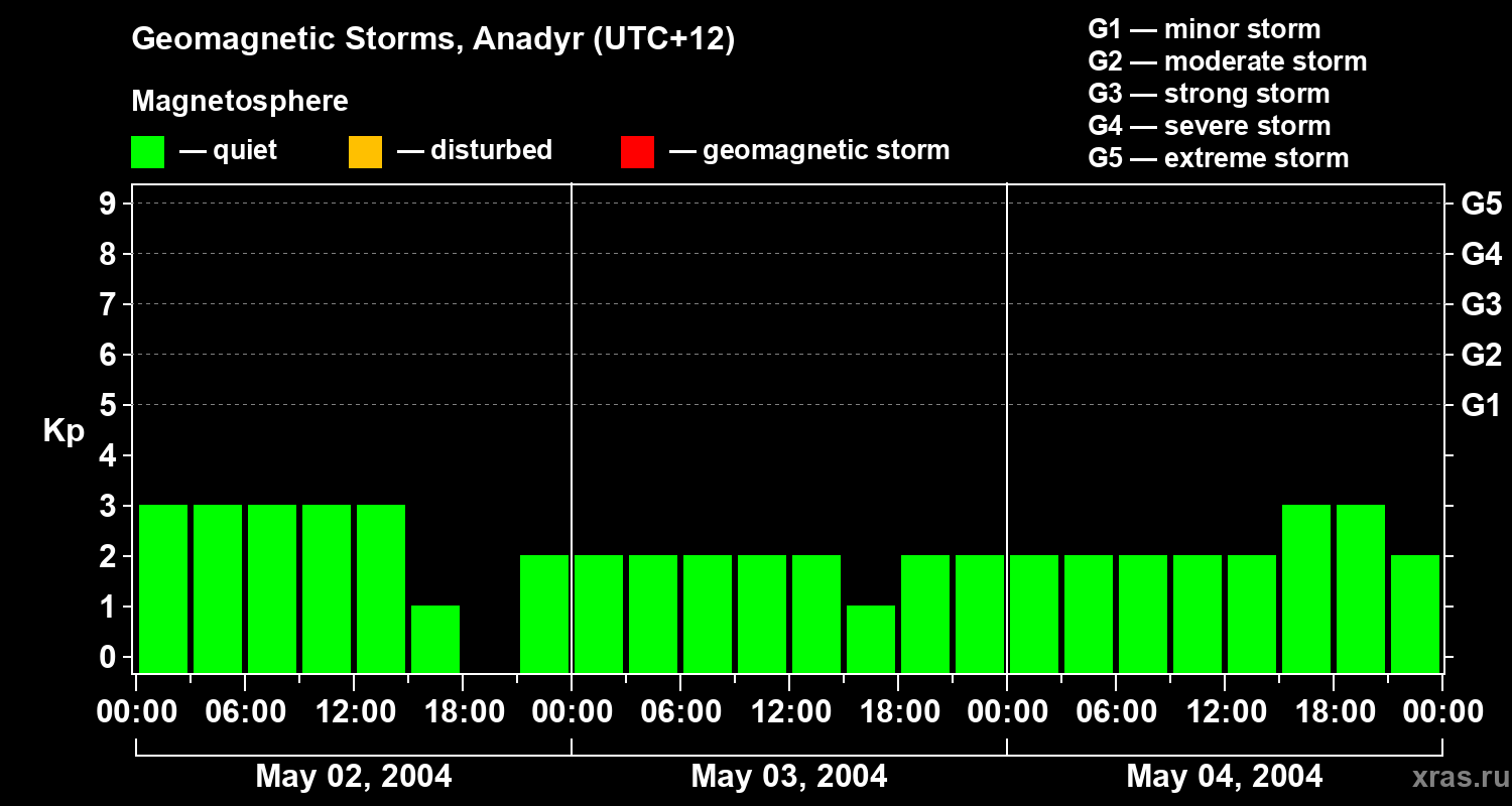 Changes in the geomagnetic index Kp from May 2 to 4, 2004 for mid latitudes
