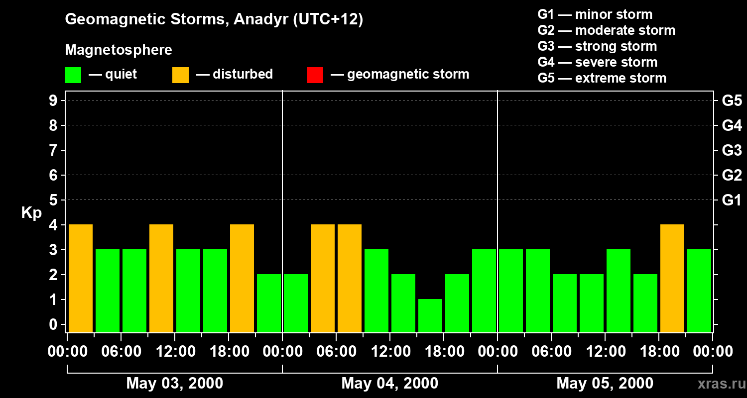Changes in the geomagnetic index Kp from May 3 to 5, 2000 for mid latitudes