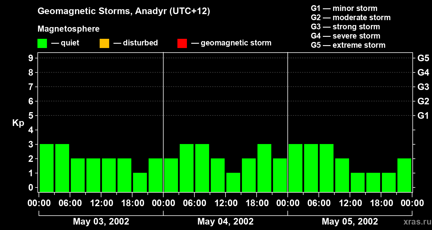 Changes in the geomagnetic index Kp from May 3 to 5, 2002 for mid latitudes