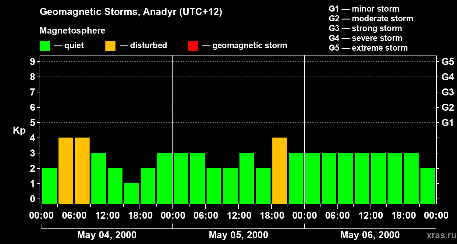 Changes in the geomagnetic index Kp from May 4 to 6, 2000 for mid latitudes