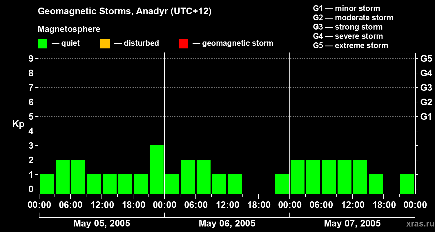 Changes in the geomagnetic index Kp from May 5 to 7, 2005 for mid latitudes