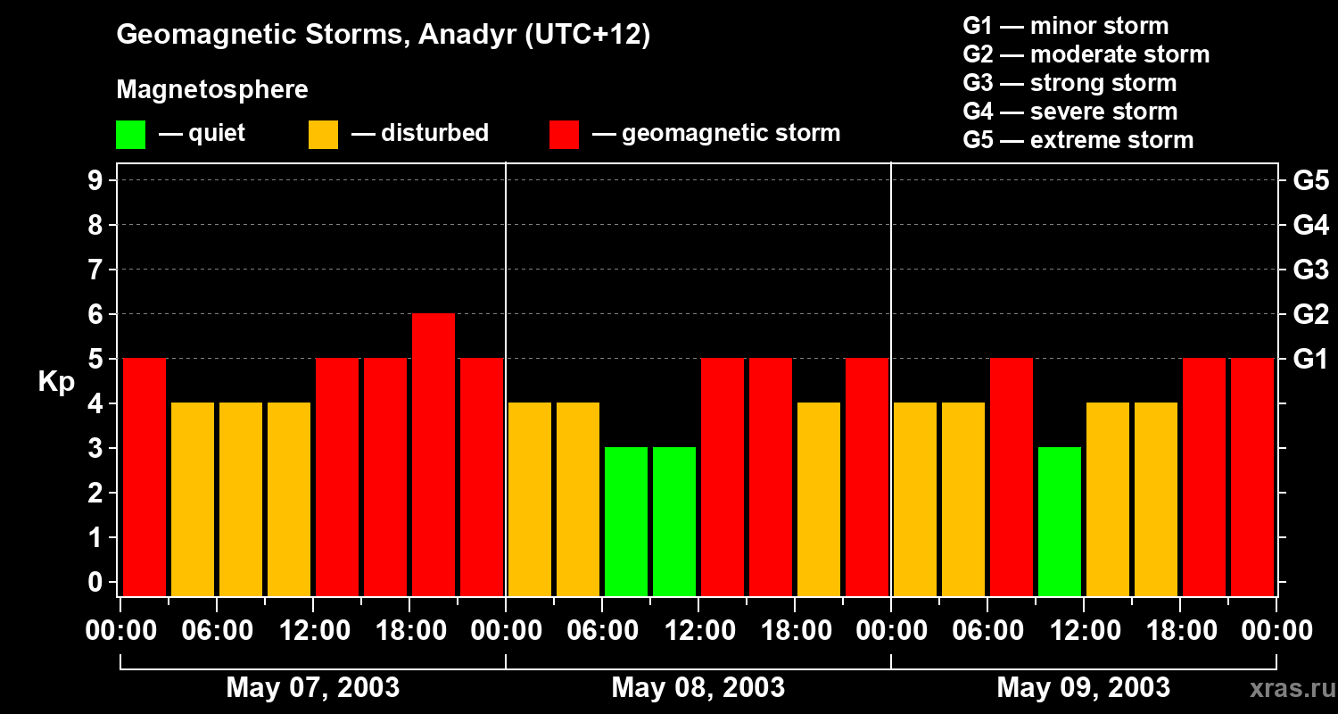 Changes in the geomagnetic index Kp from May 7 to 9, 2003 for mid latitudes