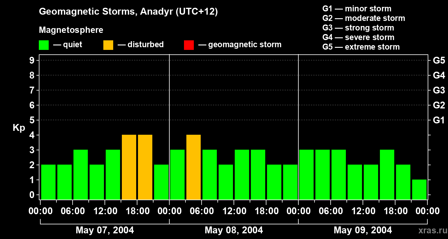 Changes in the geomagnetic index Kp from May 7 to 9, 2004 for mid latitudes