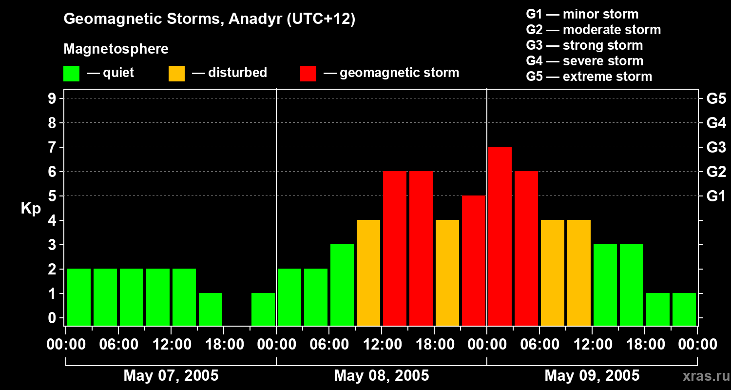 Changes in the geomagnetic index Kp from May 7 to 9, 2005 for mid latitudes