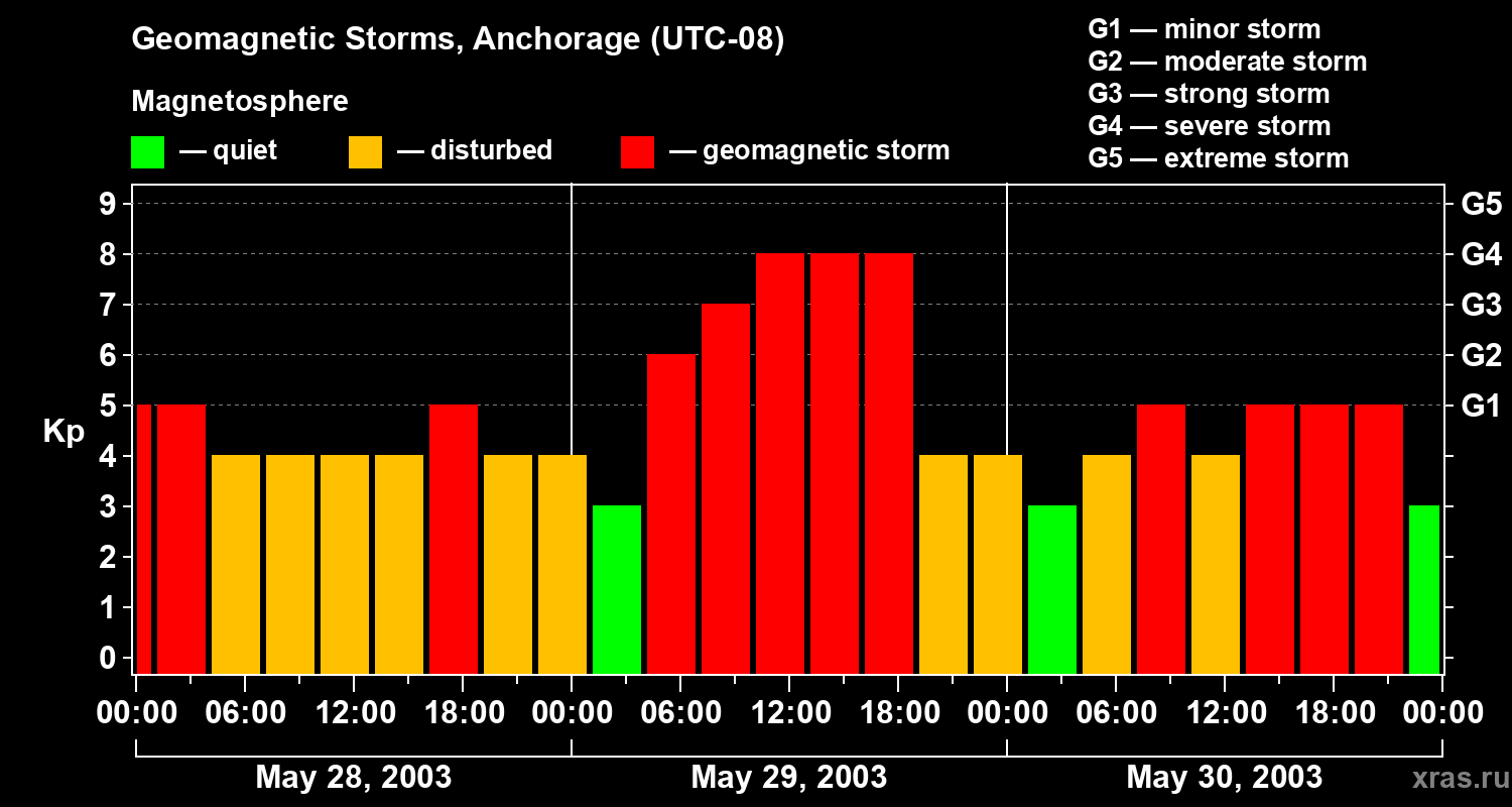 Changes in the geomagnetic index Kp from May 28 to 30, 2003 for mid latitudes