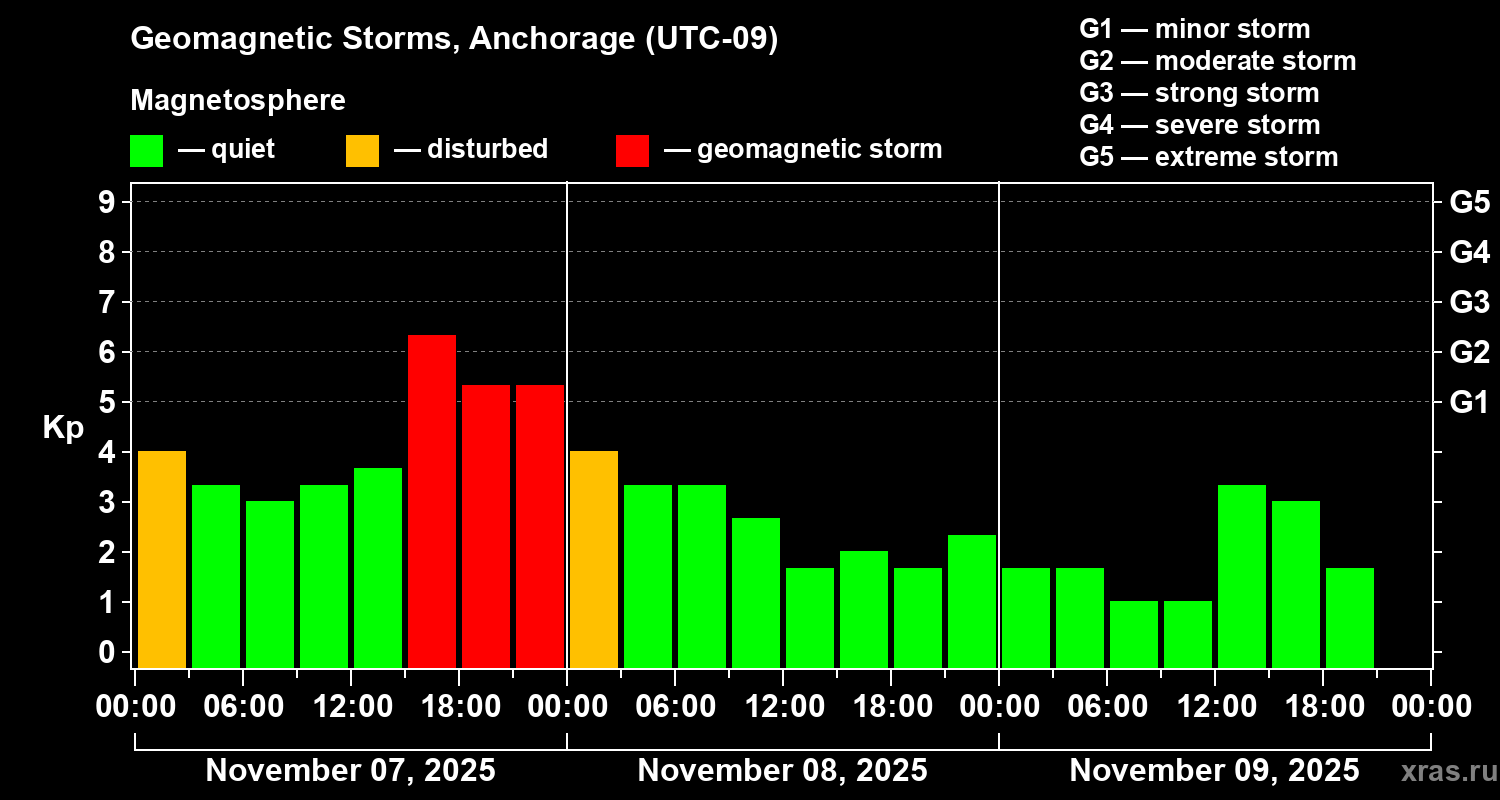 Geomagnetic storms in Anchorage — Nov 09, 2025