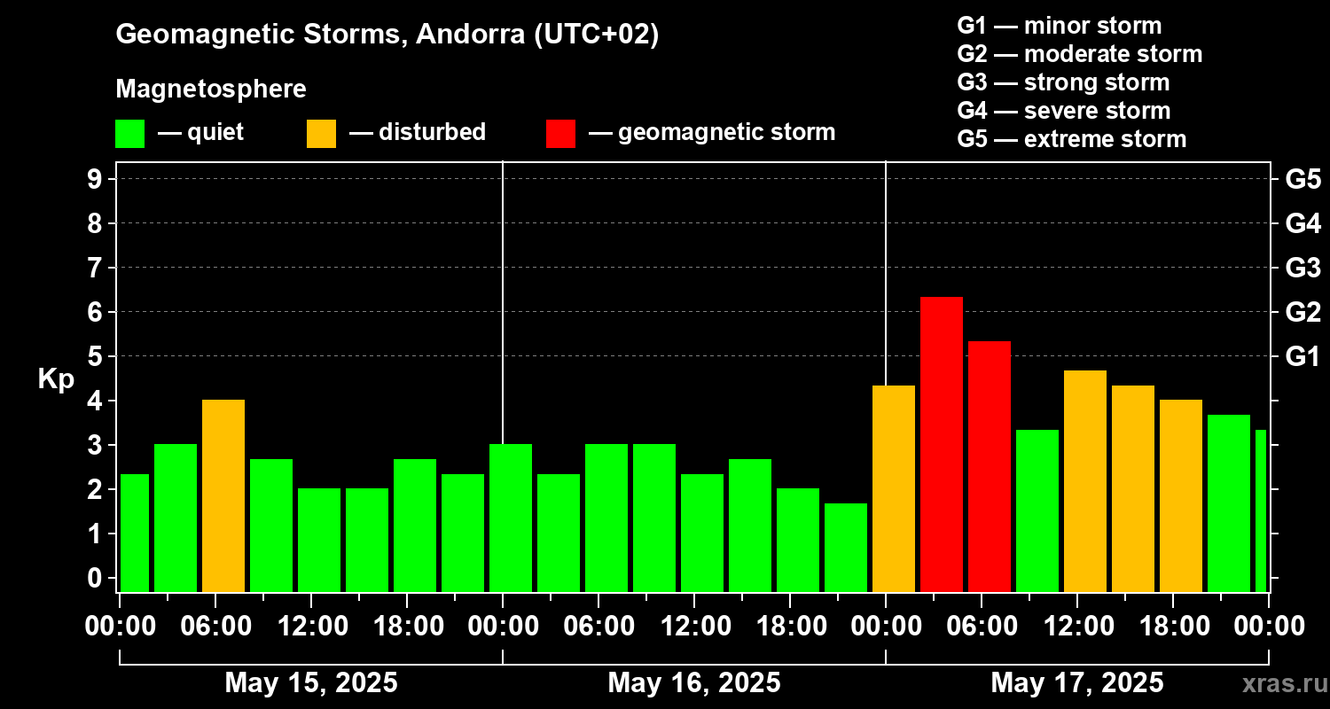 Changes in the geomagnetic index Kp from May 15 to 17, 2025 for mid latitudes