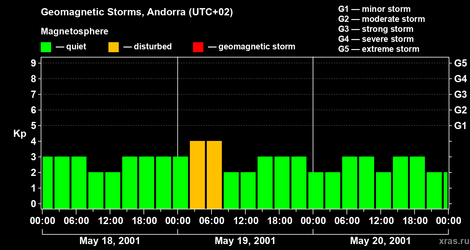 Changes in the geomagnetic index Kp from May 18 to 20, 2001 for mid latitudes