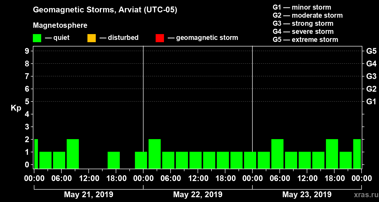 Changes in the geomagnetic index Kp from May 21 to 23, 2019 for mid latitudes