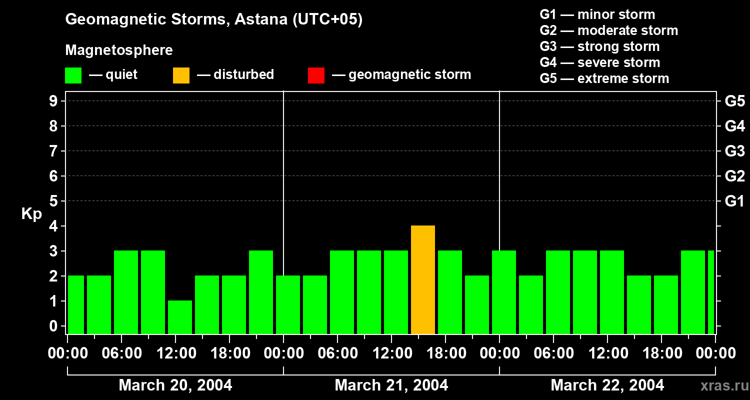 Changes in the geomagnetic index Kp from March 20 to 22, 2004 for mid latitudes
