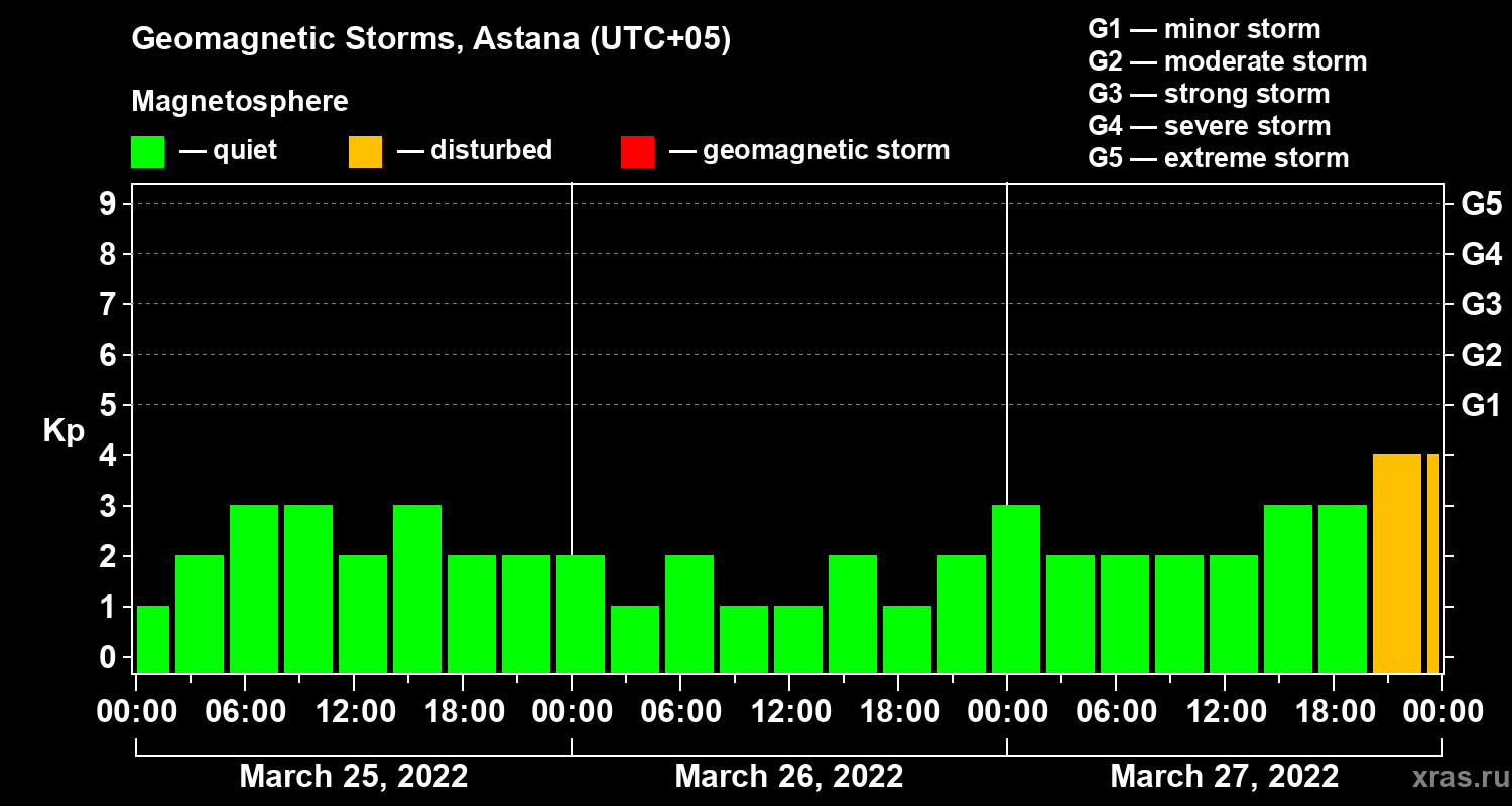 Changes in the geomagnetic index Kp from March 25 to 27, 2022 for mid latitudes
