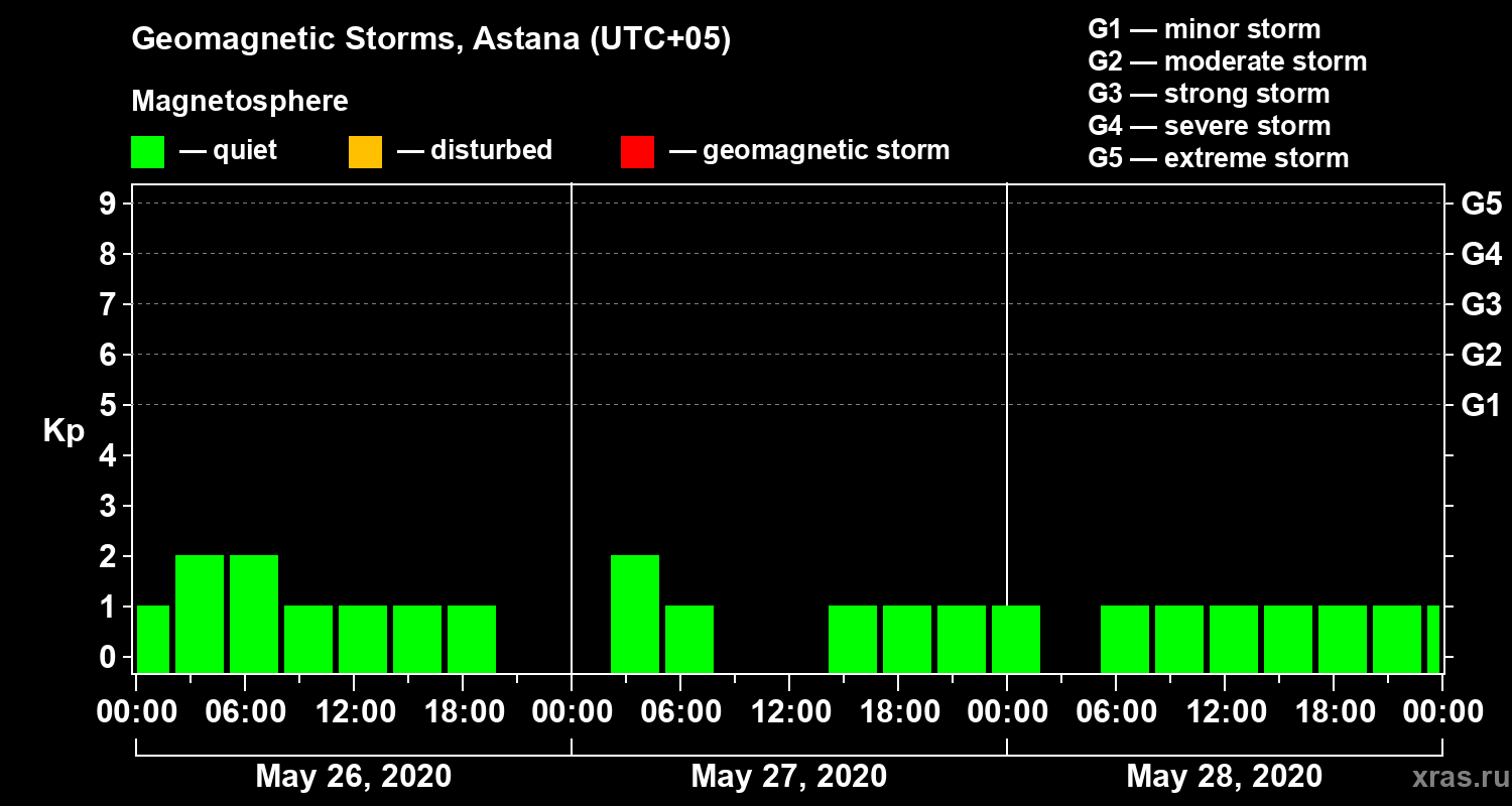 Changes in the geomagnetic index Kp from May 26 to 28, 2020 for mid latitudes