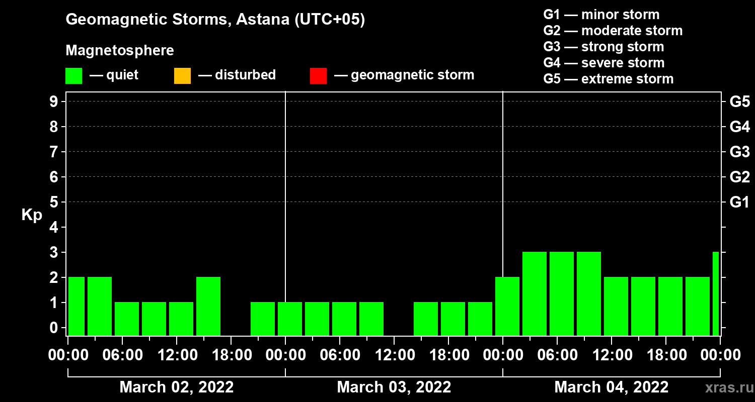 Changes in the geomagnetic index Kp from March 2 to 4, 2022 for mid latitudes