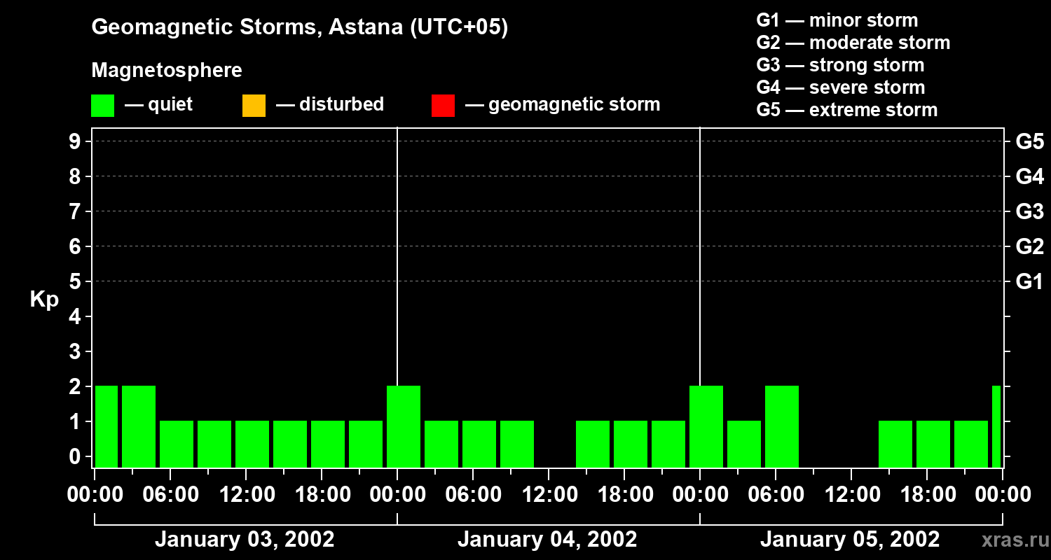 Changes in the geomagnetic index Kp from January 3 to 5, 2002 for mid latitudes
