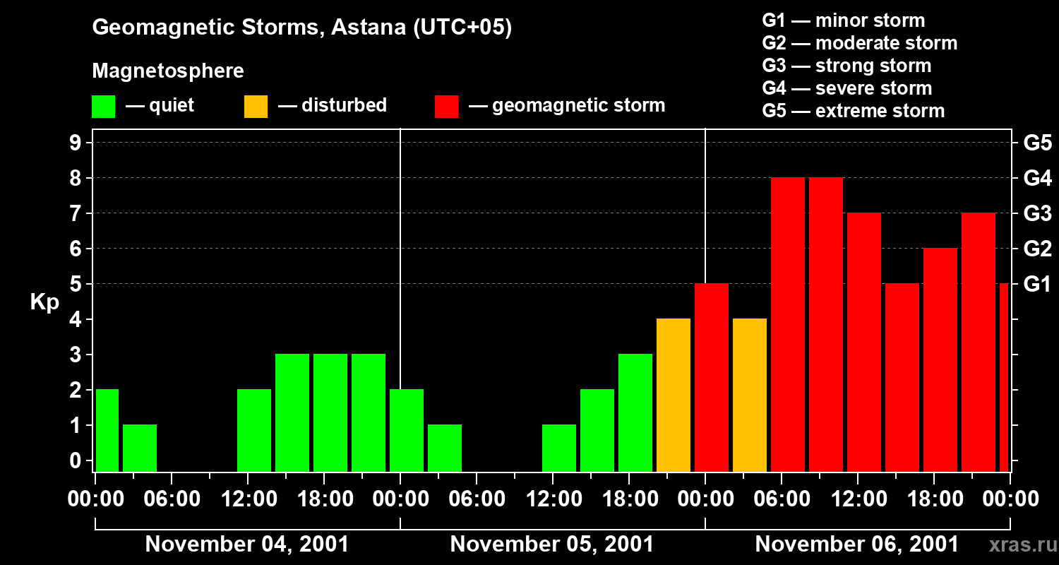 Changes in the geomagnetic index Kp from November 4 to 6, 2001 for mid latitudes