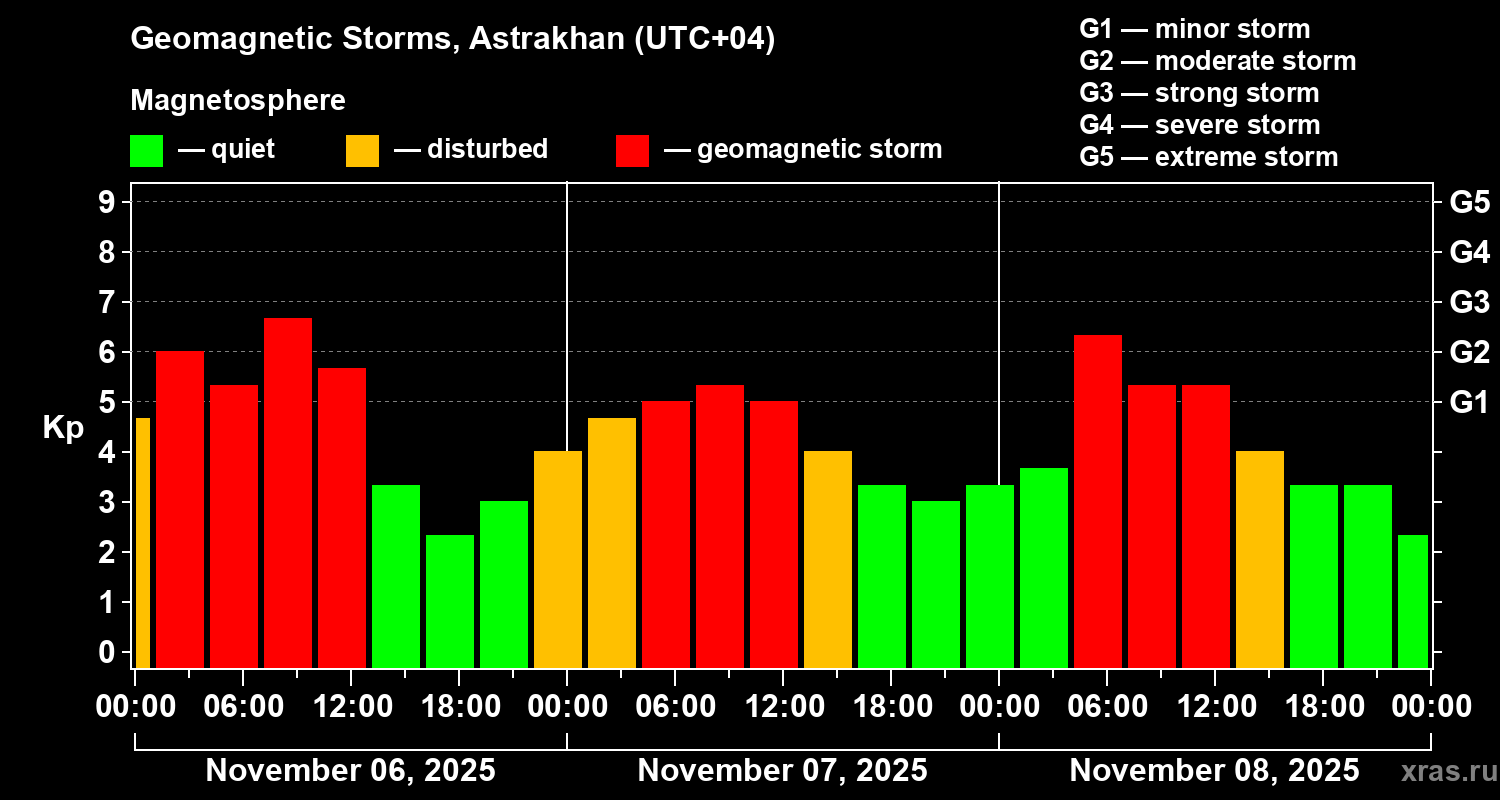 Geomagnetic storms in Astrakhan on Nov 08, 2025