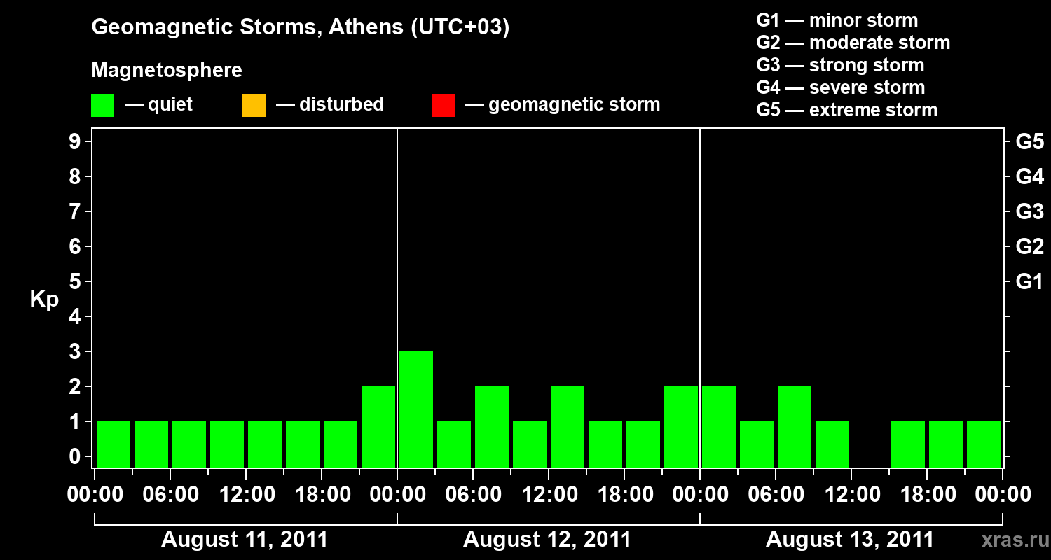 Changes in the geomagnetic index Kp from August 11 to 13, 2011 for mid latitudes