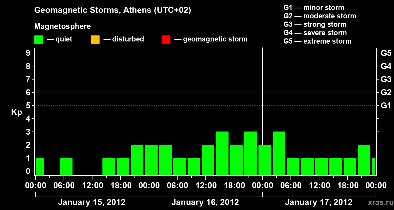 Changes in the geomagnetic index Kp from January 15 to 17, 2012 for mid latitudes