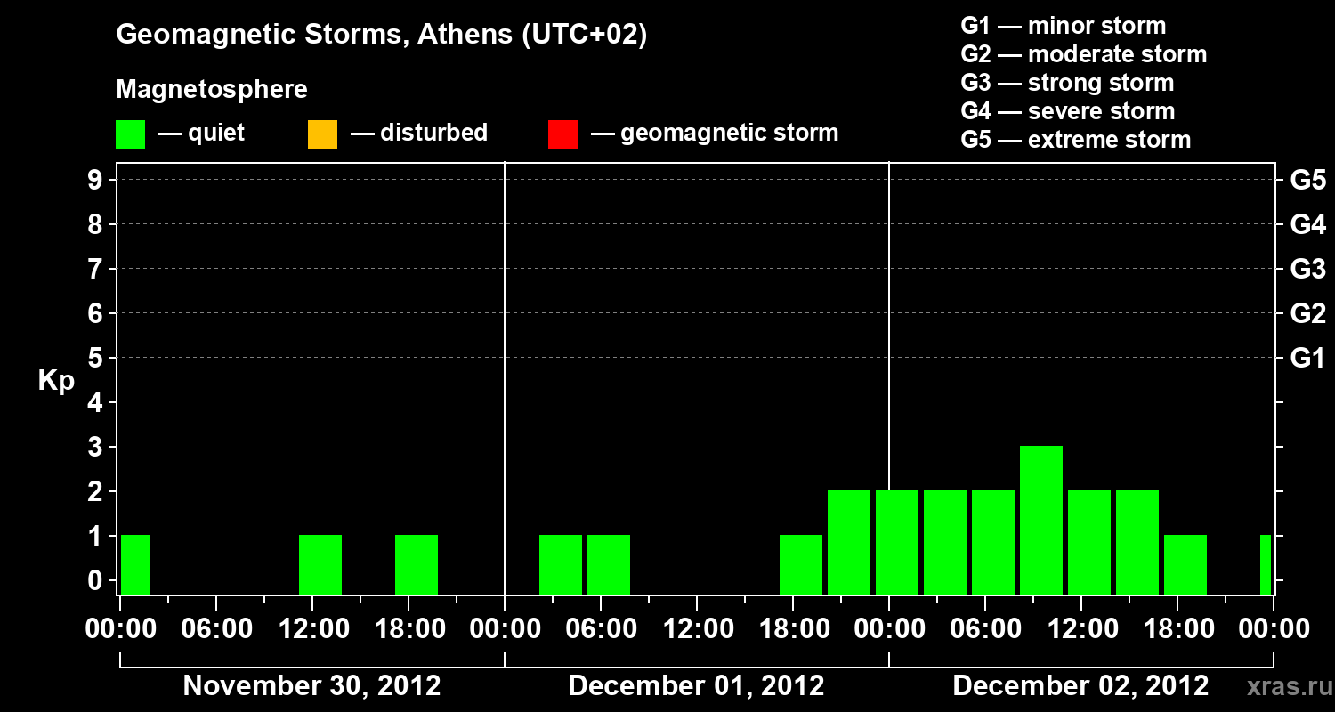 Changes in the geomagnetic index Kp from November 30 to December 2, 2012 for mid latitudes