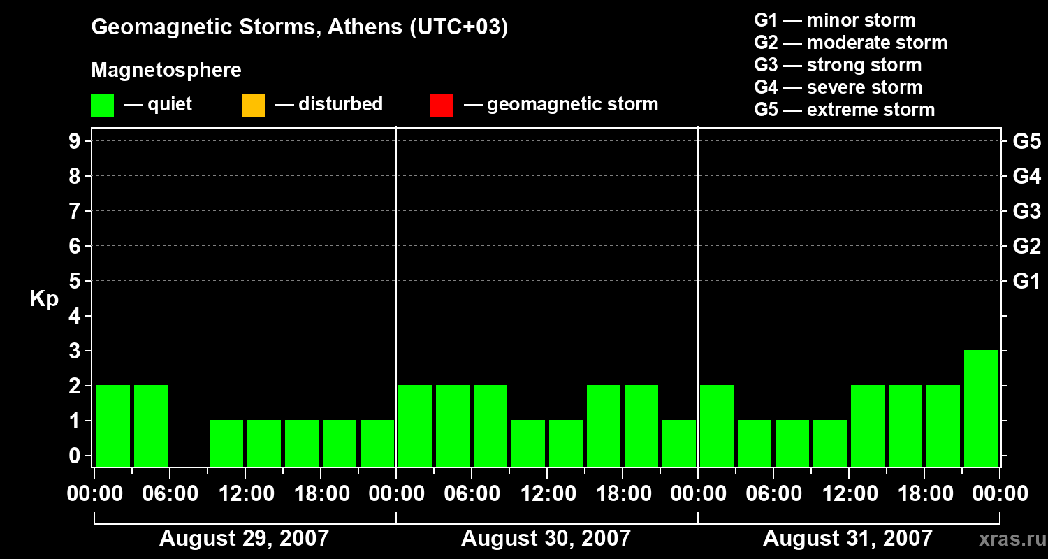 Changes in the geomagnetic index Kp from August 29 to 31, 2007 for mid latitudes
