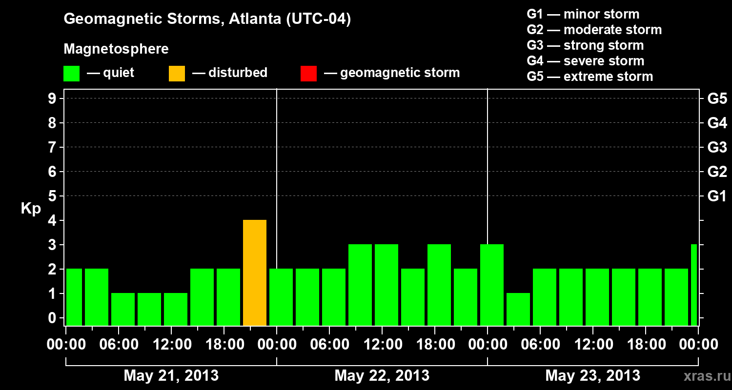 Changes in the geomagnetic index Kp from May 21 to 23, 2013 for mid latitudes
