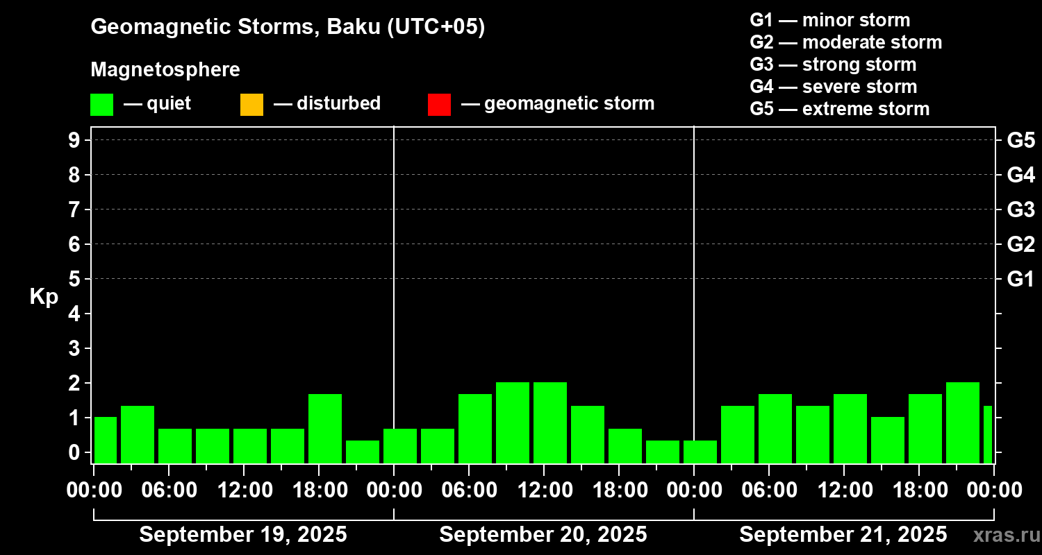 Changes in the geomagnetic index Kp from September 19 to 21, 2025 for mid latitudes
