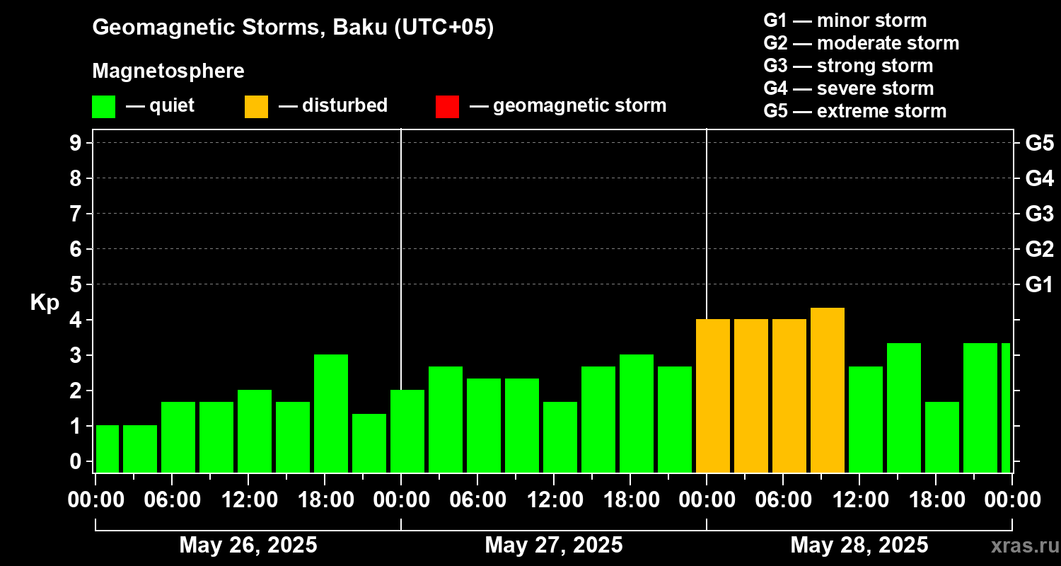 Changes in the geomagnetic index Kp from May 26 to 28, 2025 for mid latitudes