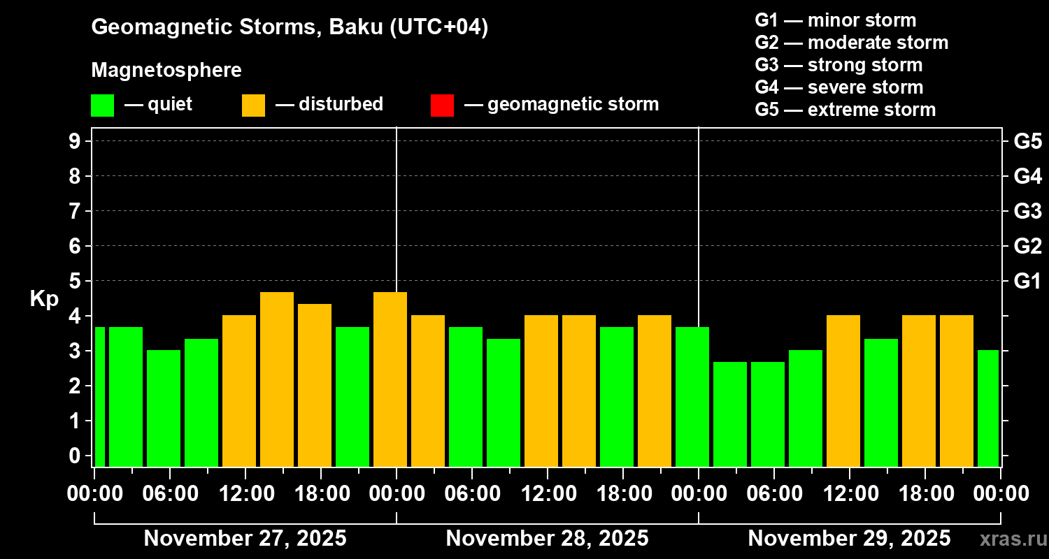 Changes in the geomagnetic index Kp from November 27 to 29, 2025 for mid latitudes