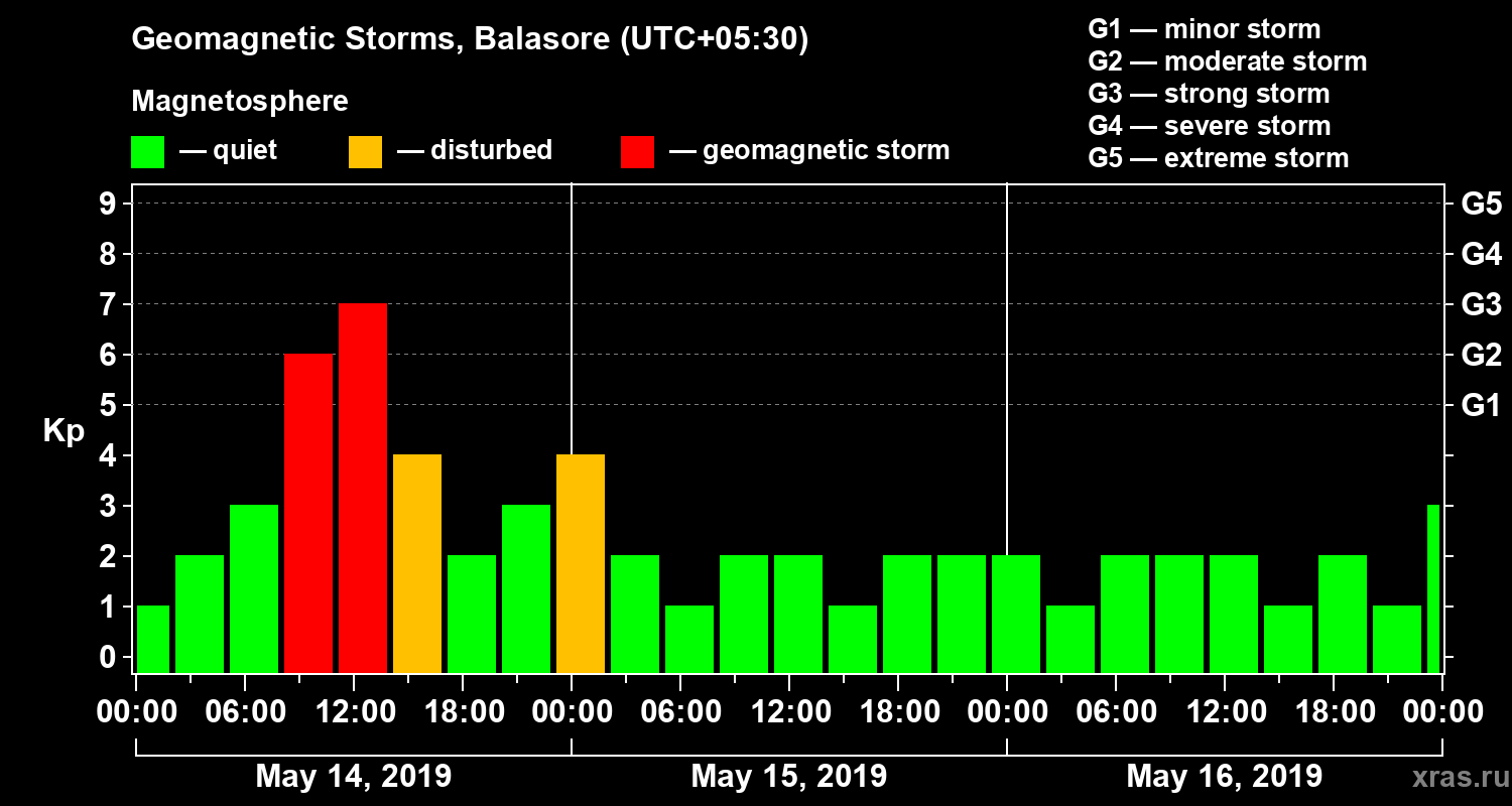 Changes in the geomagnetic index Kp from May 14 to 16, 2019 for mid latitudes