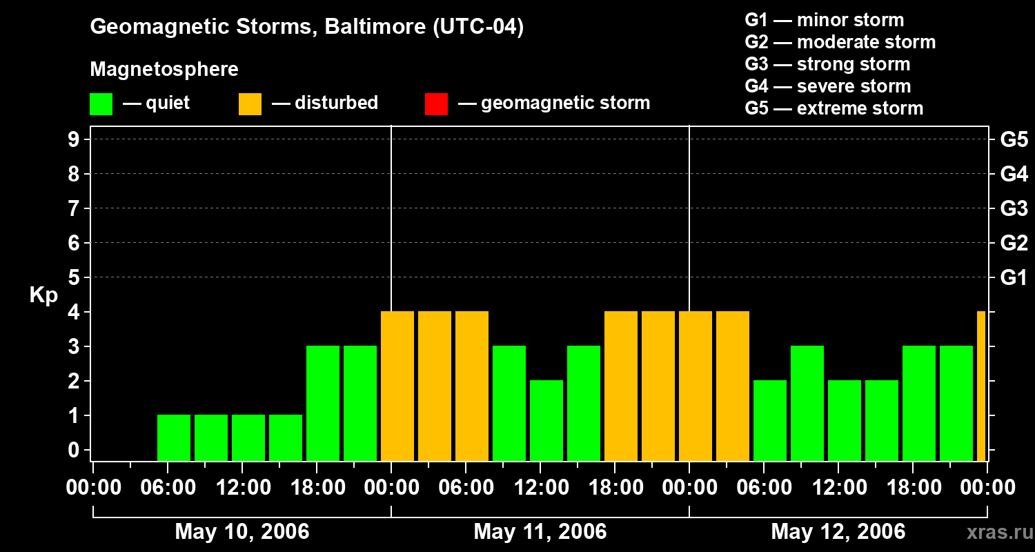 Changes in the geomagnetic index Kp from May 10 to 12, 2006 for mid latitudes