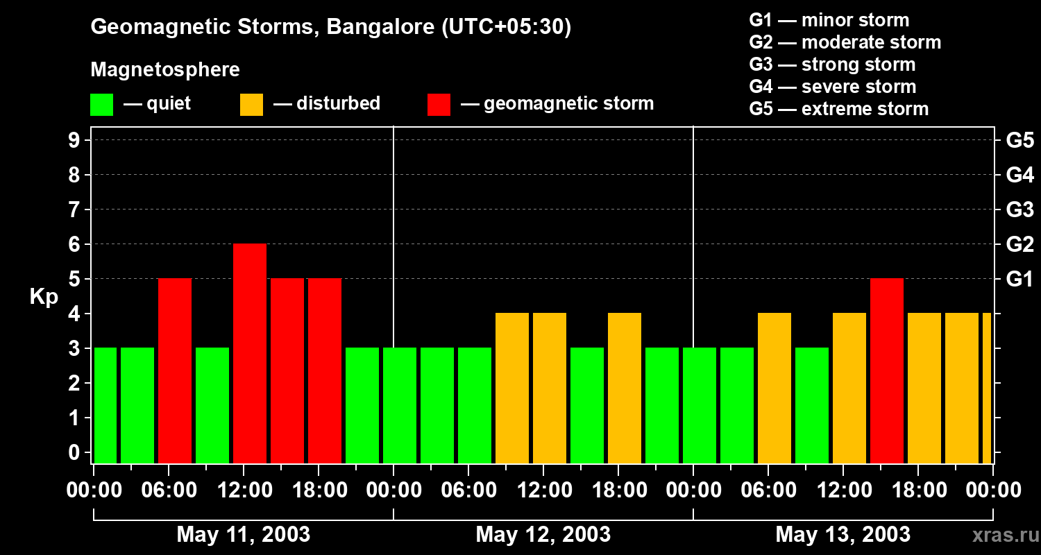Changes in the geomagnetic index Kp from May 11 to 13, 2003 for mid latitudes