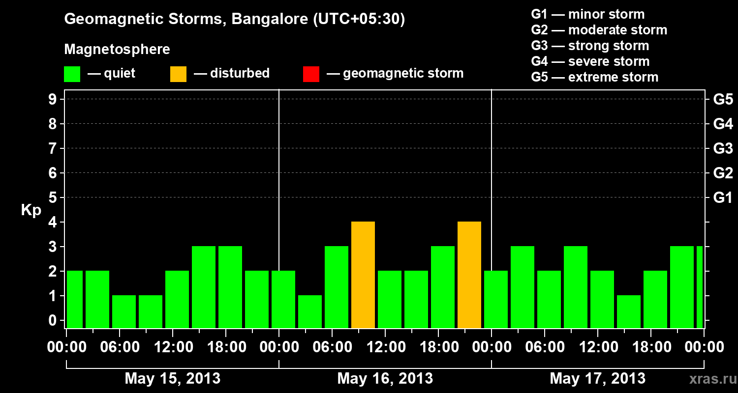 Changes in the geomagnetic index Kp from May 15 to 17, 2013 for mid latitudes