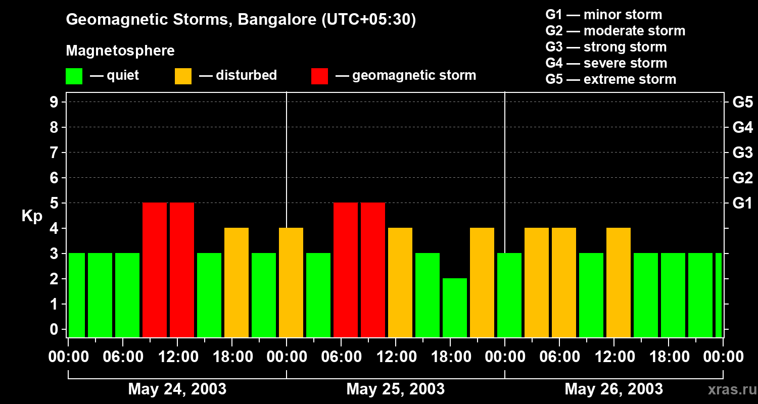 Changes in the geomagnetic index Kp from May 24 to 26, 2003 for mid latitudes