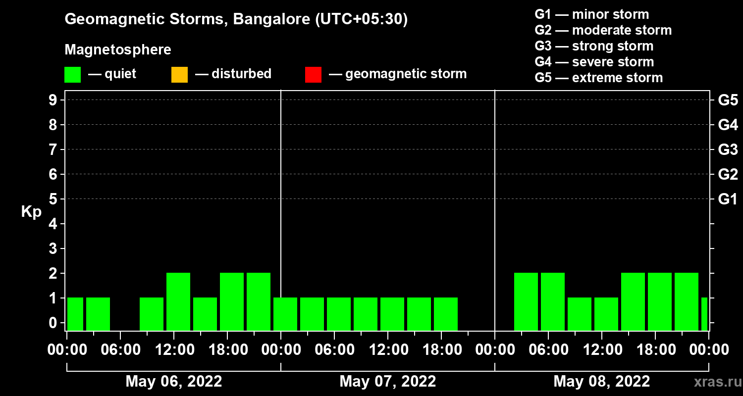 Changes in the geomagnetic index Kp from May 6 to 8, 2022 for mid latitudes