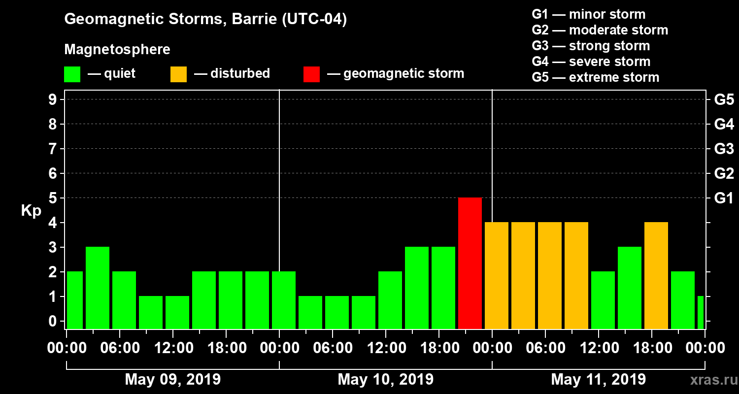 Changes in the geomagnetic index Kp from May 9 to 11, 2019 for mid latitudes