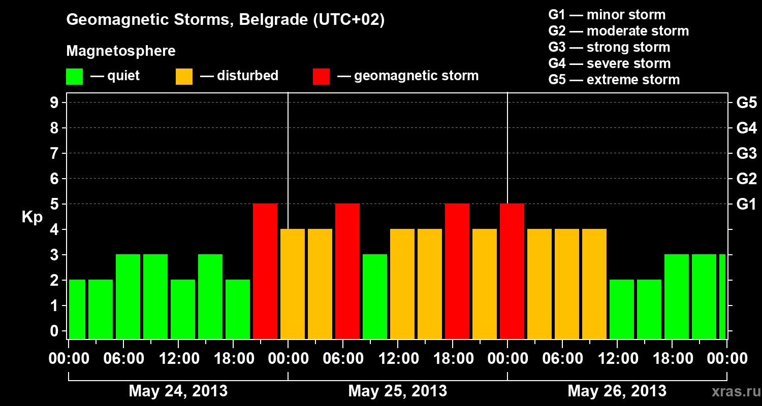 Changes in the geomagnetic index Kp from May 24 to 26, 2013 for mid latitudes
