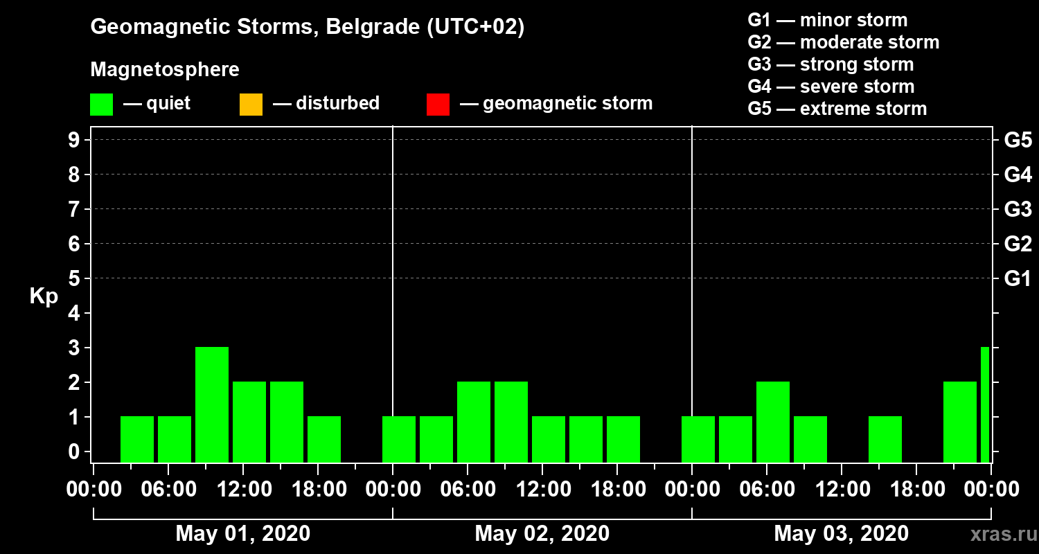 Changes in the geomagnetic index Kp from May 1 to 3, 2020 for mid latitudes