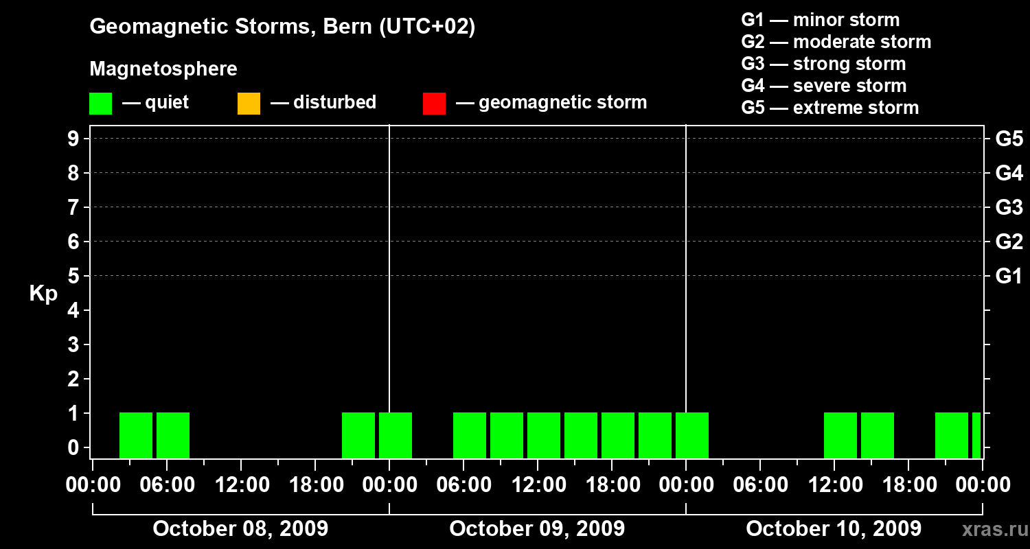 Changes in the geomagnetic index Kp from October 8 to 10, 2009 for mid latitudes