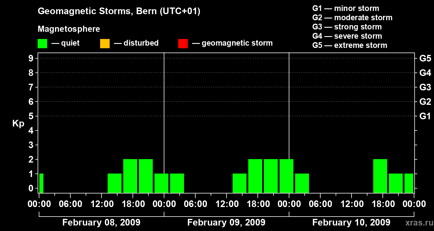 Changes in the geomagnetic index Kp from February 8 to 10, 2009 for mid latitudes