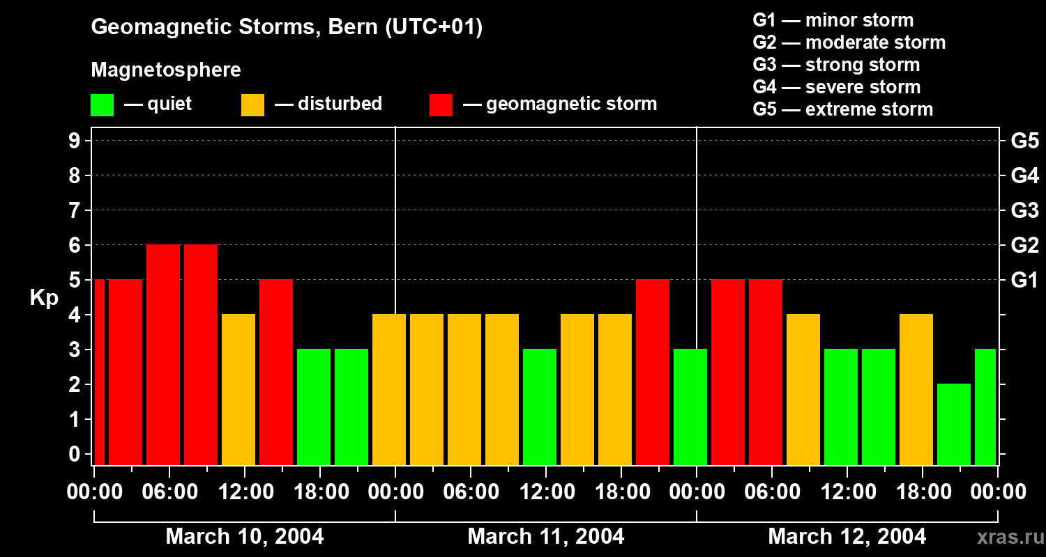 Changes in the geomagnetic index Kp from March 10 to 12, 2004 for mid latitudes