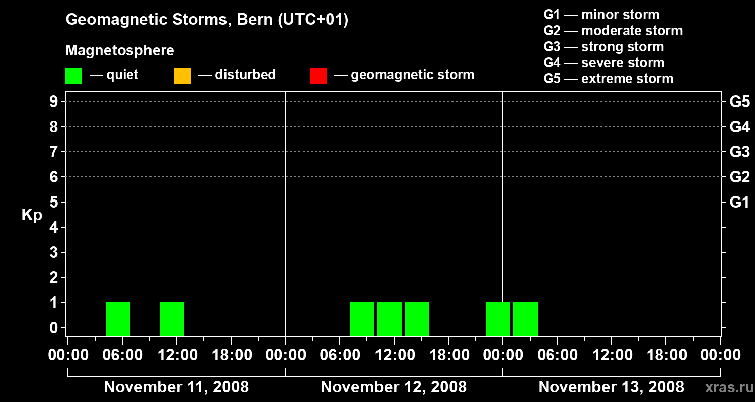 Changes in the geomagnetic index Kp from November 11 to 13, 2008 for mid latitudes