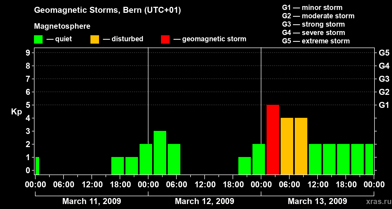 Changes in the geomagnetic index Kp from March 11 to 13, 2009 for mid latitudes