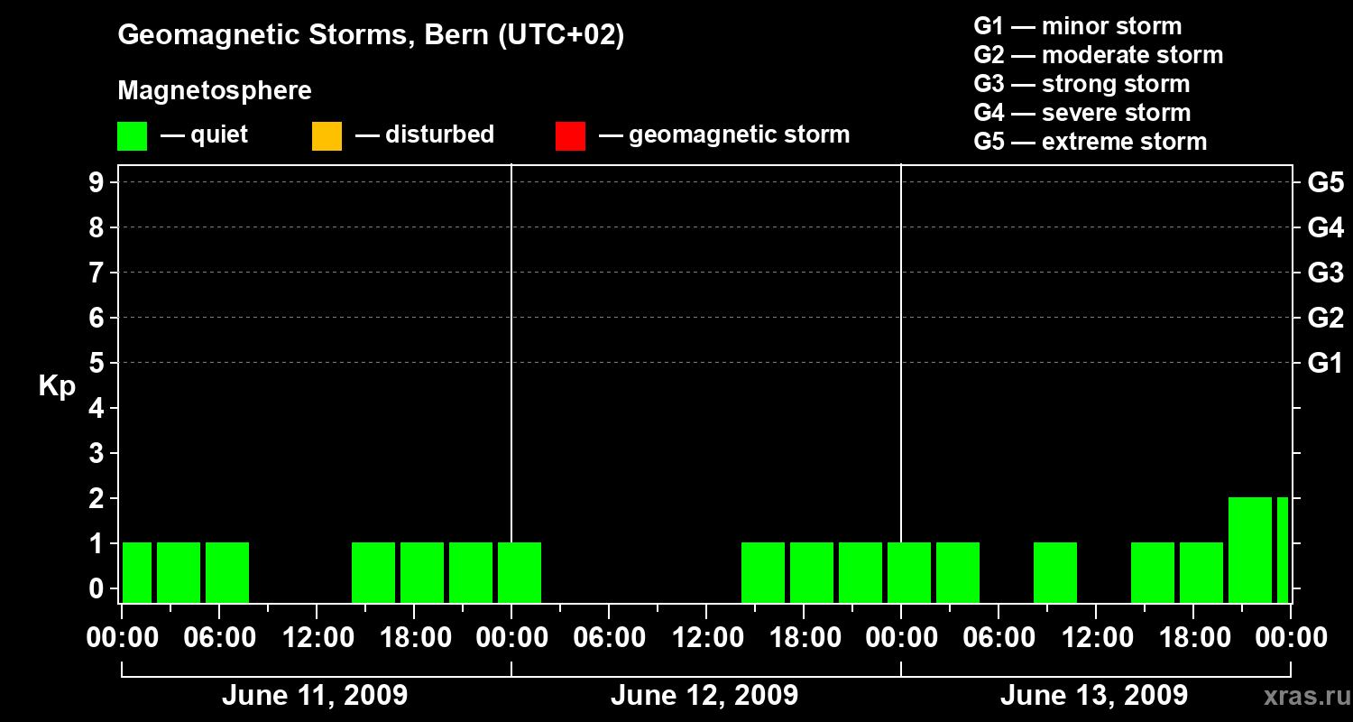Changes in the geomagnetic index Kp from June 11 to 13, 2009 for mid latitudes