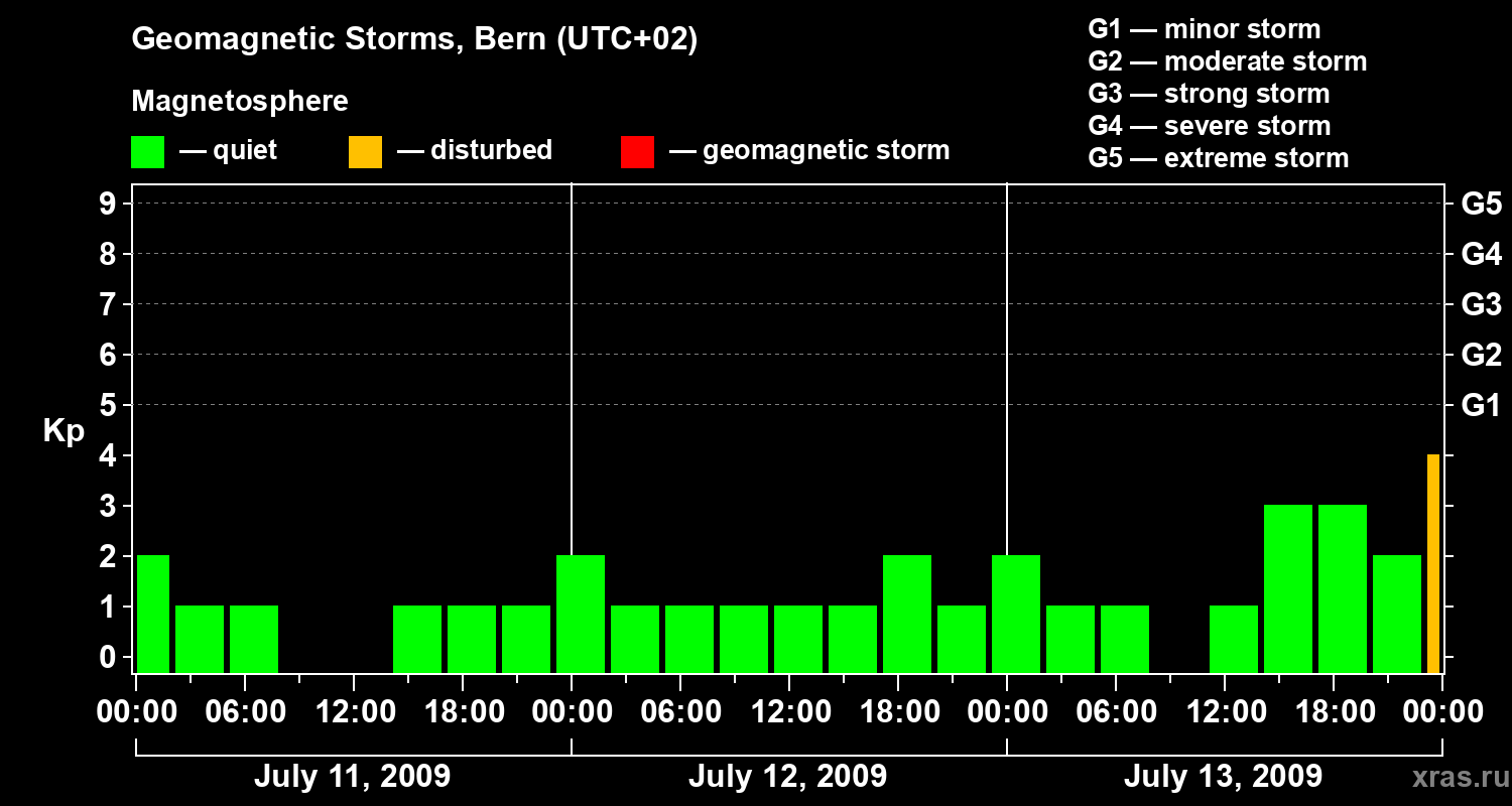 Changes in the geomagnetic index Kp from July 11 to 13, 2009 for mid latitudes