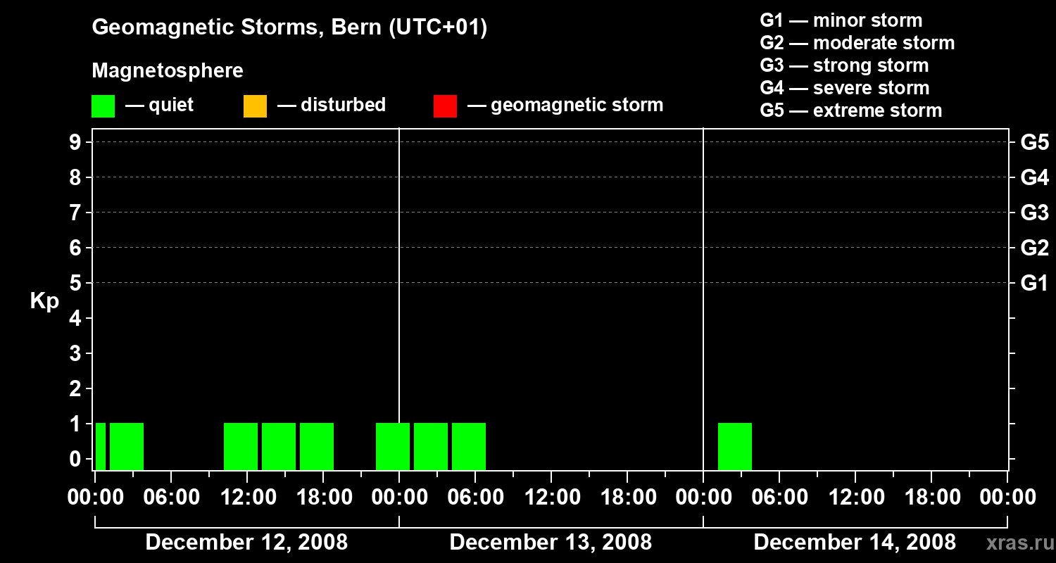 Changes in the geomagnetic index Kp from December 12 to 14, 2008 for mid latitudes
