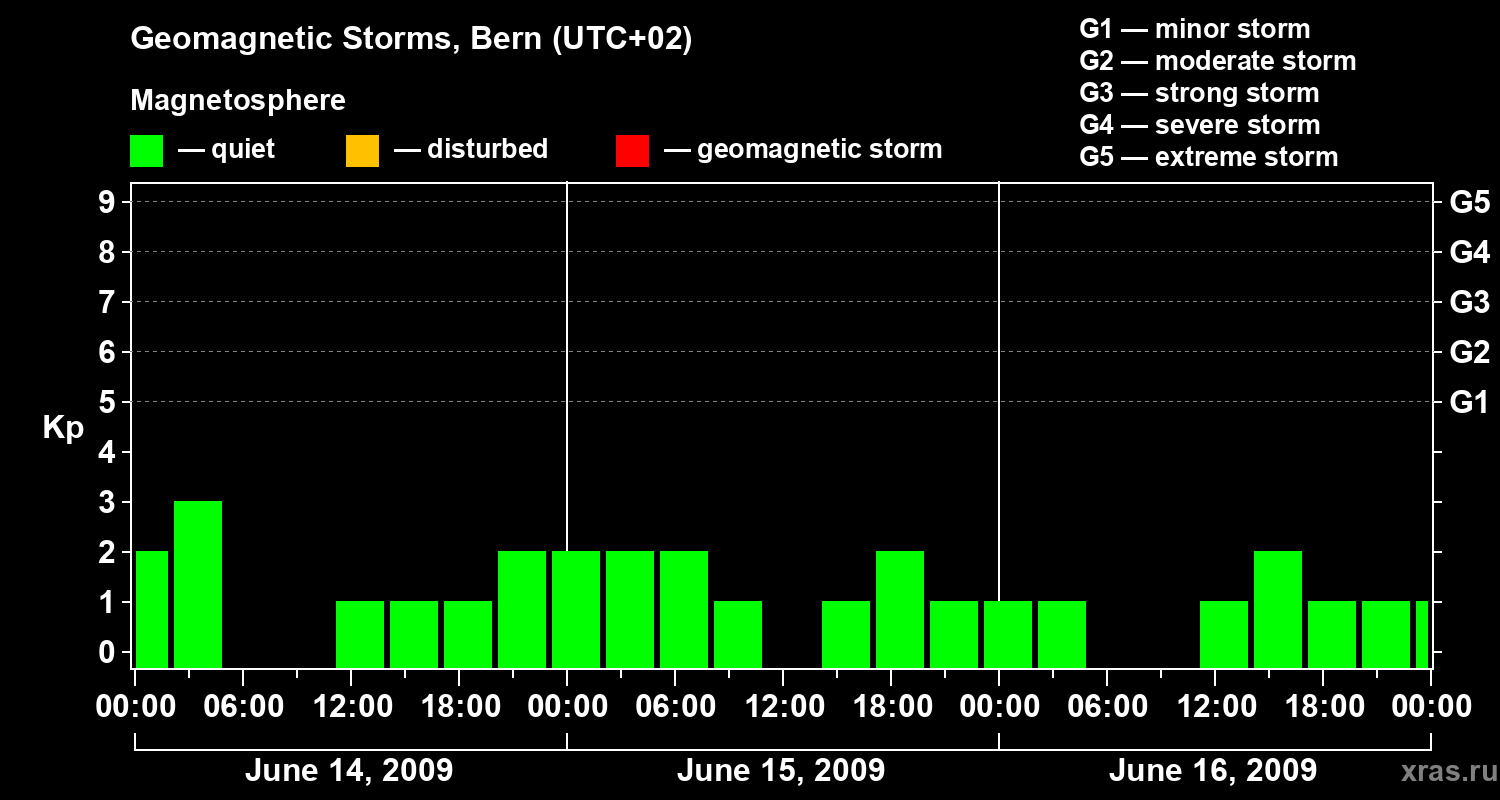 Changes in the geomagnetic index Kp from June 14 to 16, 2009 for mid latitudes