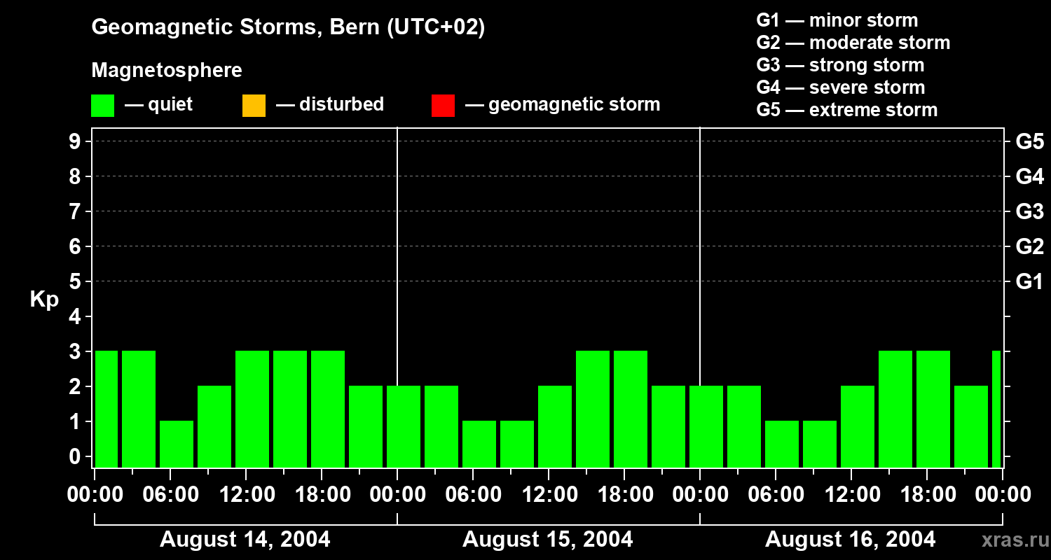 Changes in the geomagnetic index Kp from August 14 to 16, 2004 for mid latitudes