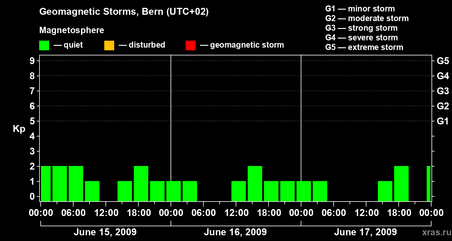 Changes in the geomagnetic index Kp from June 15 to 17, 2009 for mid latitudes